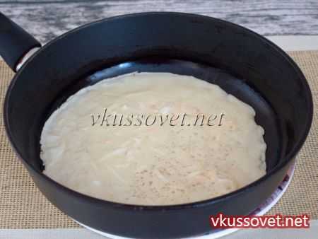 На раскаленную сковороду налейте тесто и круговыми движениями распределите по всей поверхности.