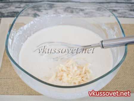 Перемешайте (взболтайте) массу венчиком или миксером до однородной консистенции. Налейте теплого молока и снова перемешайте. Затем введите в тесто сухие продукты – разрыхлитель и муку.