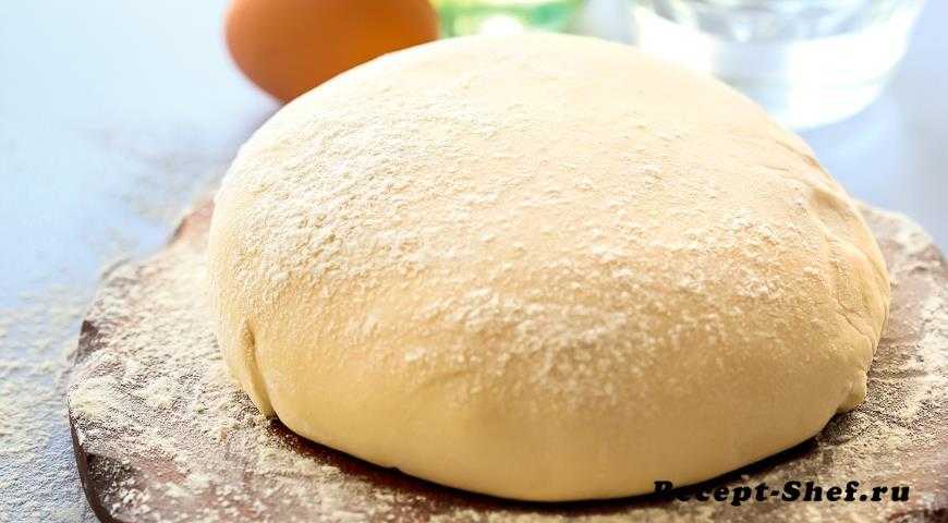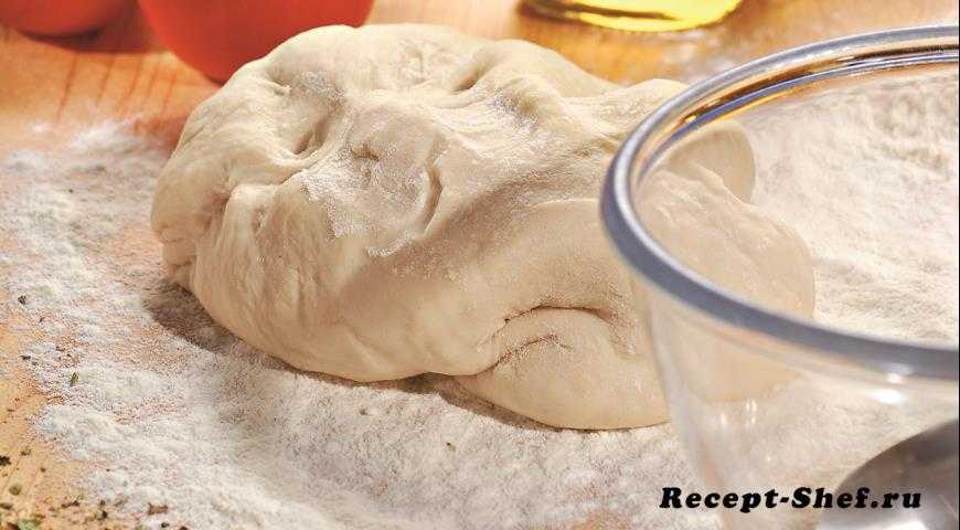 Положить тесто на широкую доску, вымесить (6–8 минут) до придания однородности и пластичности. Скатать в окружность, накрыть полотенцем, оставить на 15 минут. После чего тонко раскатать в пласт, посыпать сверху мукой, еще раз накрыть, оставить на 15 минут.