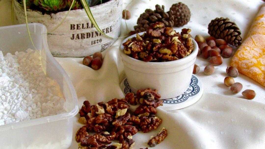 - Очистить орехи, поджарить на сковороде, измельчить.