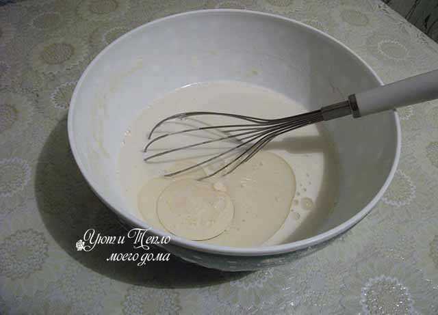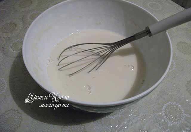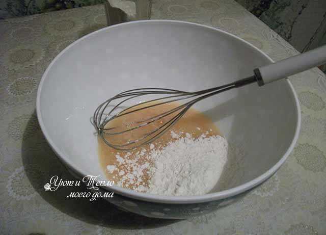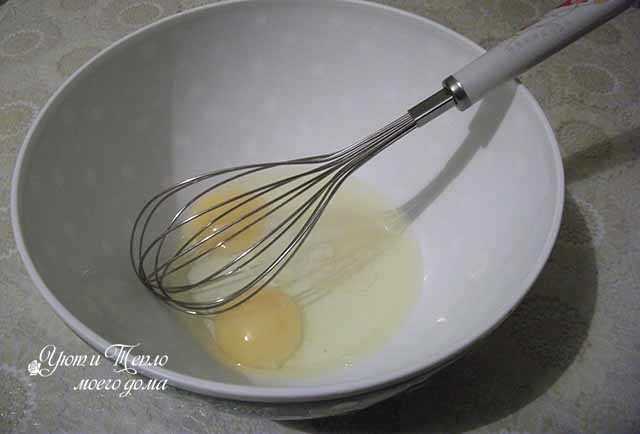 Вы увидите как мука в яйцах хорошо перемешивается и взбивается венчиком.