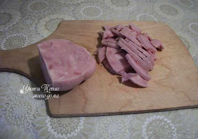 А ветчину нарезаю соломкой, можно тоненькими пластинками сделать или тоже на терку пустить, кому как нравится.