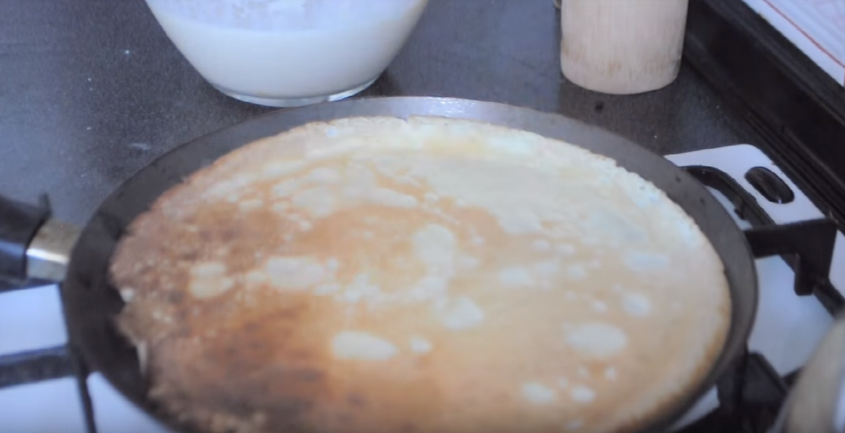 6. С первой стороны блин пропекается за 30 секунд. Затем его нужно переввернуть и пропечь с другой стороны в течение 15-20 секунд.