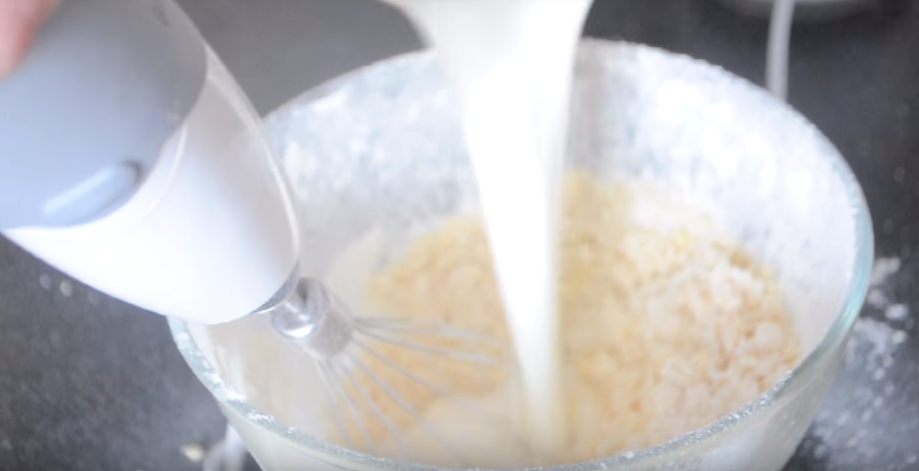 3. Начинаем вливать в миску молоко небольшими порциями и взбивать смесь блендером.