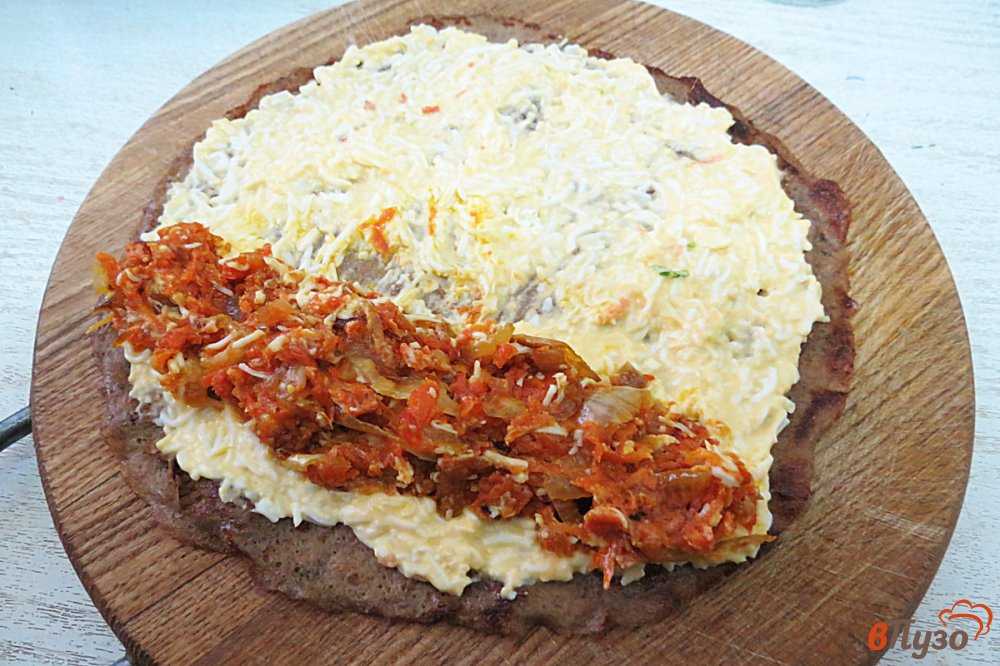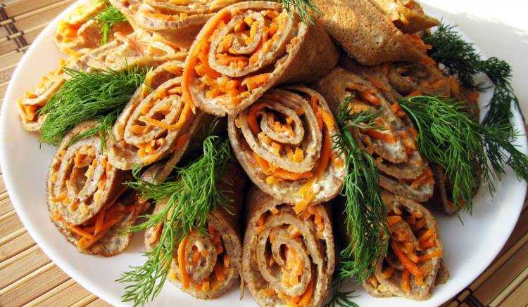 - Каждый блин смазать майонезом, затем распределить лук и морковь, свернуть рулетом.