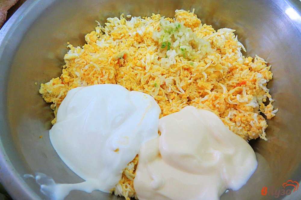 К яйцам добавляем чеснок, сметану и половину майонеза.