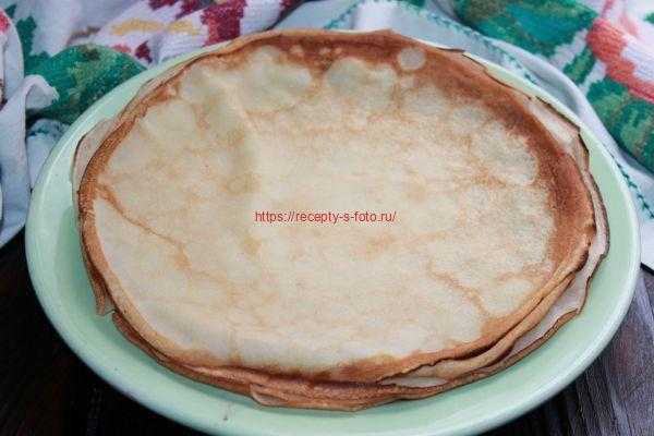 - Пожарить блины (каждый на чайной ложке растительного масла), сложить их стопкой, промазав сливочным маслом.