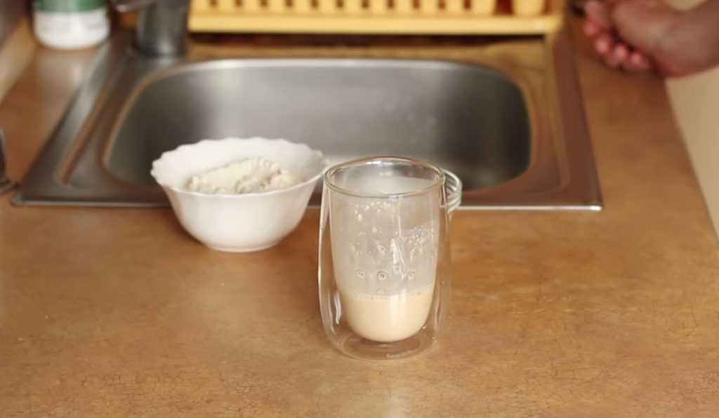 Тщательно перемешать, чтобы не образовались комочки. Накрыть ёмкость пищевой плёнкой или салфеткой. Отставить опару на 30 минут в тёплое место. Когда она полностью подойдёт, её объём увеличится примерно в два раза.