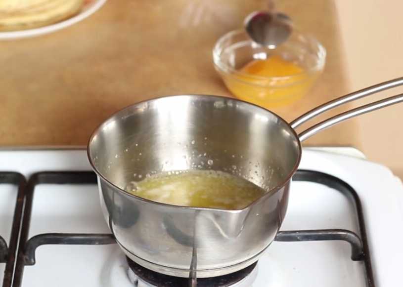 Как все блинчики готовы, можно начать готовить соус. Берем небольшую кастрюльку и кладем масло. Растапливаем его.