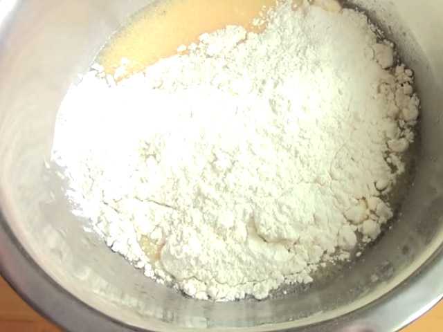 - Следующим шагом всыпьте муку и влейте 2 ложки масла. Тщательно перемешайте — можно воспользоваться миксером.
