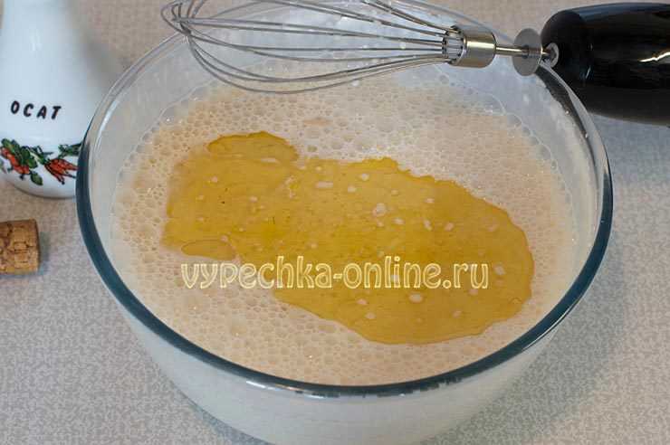 5. Теперь самое время добавить масло. Можно добавить только растительное масло, в этом случае используйте его в объеме 4 столовые ложки. Но я добавляю только три ложки. А четвертая ложка у нас будет растопленное сливочное масло. Благодаря ему наши вкусняшки получатся более нежными и ароматными.