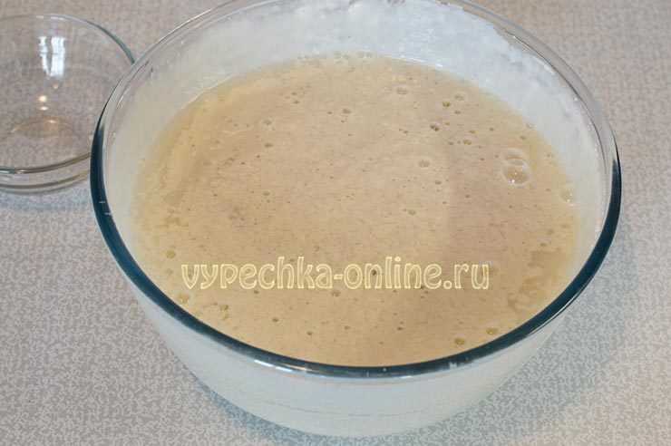 Массу снова перемешиваем, чтобы и яйца и все остальные компоненты хорошенько распределились в готовом тесте. И как мы можем видеть, дрожжи уже включились в работу и на поверхности стало появляться много пузырьков.