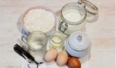 Первым делом в емкости для теста разотрите яйца с солью и сахаром. Убедившись, что сахар растворился, добавьте по одному стакану молока и муки, хорошенько взбейте при помощи миксера или венчика. Дозировано введите еще по одному стакану простокваши и муки. Перемешайте до полного растворения муки.