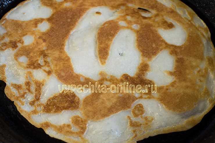 Теперь масса будет достаточно жидкой, чтобы печь блинчики. Дайте ей отстояться и через 10-15 минут начинайте готовить. Поставьте сковородку на средний огонь и раскалите. После того как посуда нагрелась, равномерно вылейте на дно немного теста. Как только на поверхности лепешки появятся пузырьки, переверните ее и обжарьте.