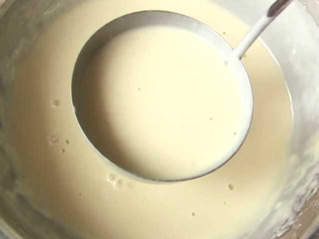 2. Кислое молоко немного согреть. Можно сделать это на водяной бане. Нужная температура молока должна быть примерно 38 – 40 градусов. Влить его тонкой струйкой при постоянном помешивании в мучную смесь.