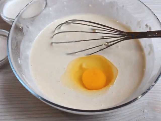 - Взбейте, чтобы тесто получилось без комочков, влейте остатки молока и оставьте тесто на 10−15 минут. Оно должно быть достаточно жидким. Если вы видите, что оно слишком густое, добавьте пару столовых ложек горячей воды — вкус от этого не пострадает.