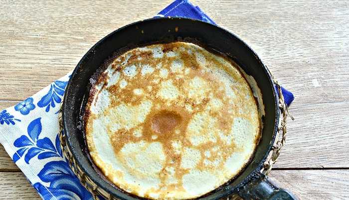 5. Перед жаркой разогрейте сковороду. Смазывайте ее небольшим количеством растительного масло перед выпечкой каждого блина. Вылейте на сковороду небольшое количество теста и равномерно распределите по сковороде, немного поворочав ее по окружности.