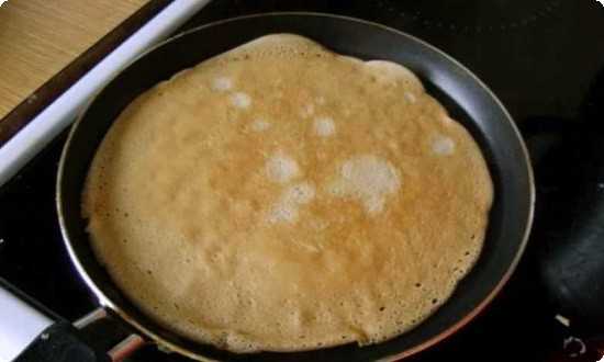 Раскалить сковороду, смазанную небольшим количеством масла. Влить первый черпак теста и распределить его, поворачивая сковороду в разные стороны, по всей поверхности. Когда зарумянится первая сторона, нужно аккуратно перевернуть и обжарить с другой.