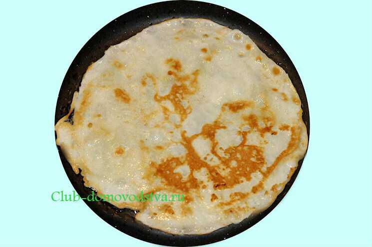 — когда блинчик на сковороде станет сухим и на его поверхности уже не будет видно сырого теста, нам нужно поддеть его чем-либо и перевернуть, чтобы поджарить обратную сторону.