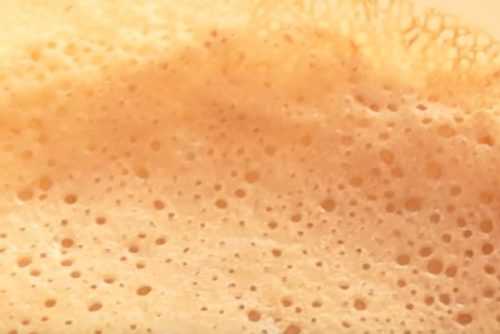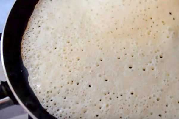 Как же гарантированно получить желанные кружевные дырочки? Необходимо выбрать чугунную сковородку или сковороду с антипригарным покрытием. Можно ещё смазывать поверхность сковороды маслом перед каждым блинчиком. Жарим на среднем огне, предварительно разогрев сковородку.