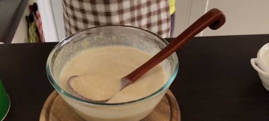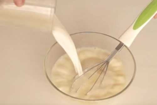 7. Берем оставшееся молоко и тонкой струйкой выливаем в миску и венчиком перемешиваем тесто до однородного состояния.