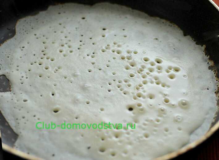 3. На хорошо разогретой сковороде, смазанной растительным маслом, начните выпекать блины. Вылейте порцию теста ровным слоем по ее периметру. Оно будет хорошо пропекаться и в этом момент вы увидите как пузырьки будут подниматься наверх и тут же лопаться.