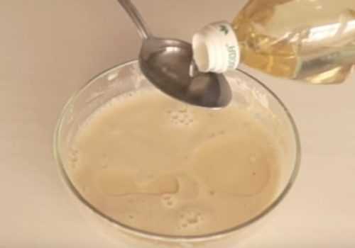 К блинному тесту добавьте указанное количество растительного масла без запаха и 160 миллилитров воды, охлажденной до комнатной температуры