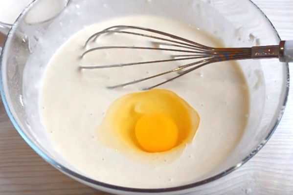 1. Размешайте в миске яйцо с сахаром и солью, чтобы они растворились. Взбейте до появления совсем легкой пенки.