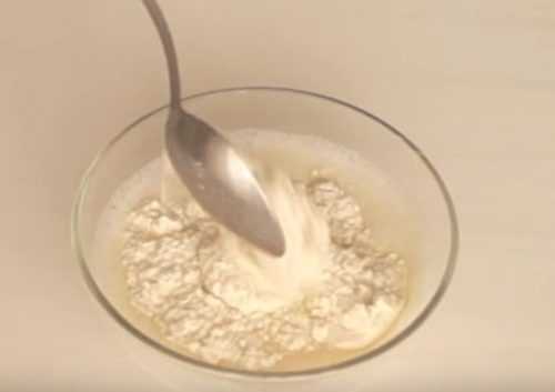 3. Добавьте в смесь муку и крахмал, хорошенько размешайте венчиком до растворения всех комочков.