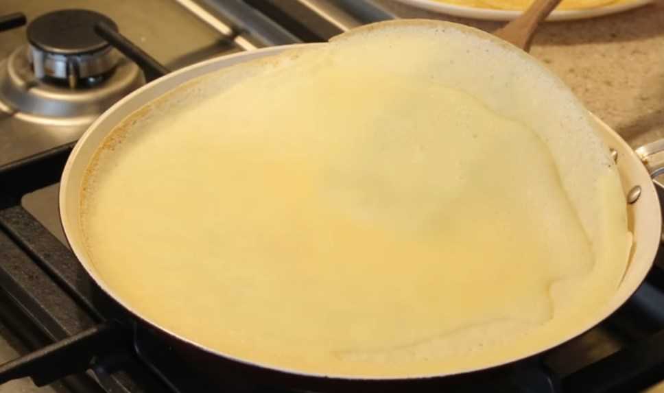 — когда блинчик на сковороде станет сухим и на его поверхности уже не будет видно сырого теста, нам нужно поддеть его чем-либо и перевернуть, чтобы поджарить обратную сторону.