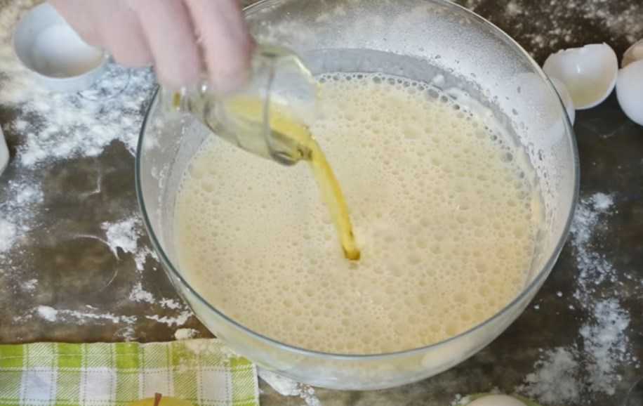 1. Яйца взбиваем с сахаром, постепенно добавляем муку с разрыхлителем, молоко и воду. Лучше выбрать минеральную газированную. Жидкое тесто должно иметь однородную консистенцию. В конце добавляем растительное масло.