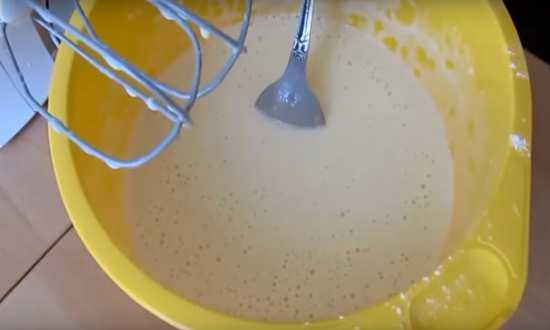 - Затем вбить в него яйца, посахарить и посолить, перемешать, затем добавить соду. Яйца нужно перемешать особенно тщательно, кефир приобретет ровный желтоватый цвет.