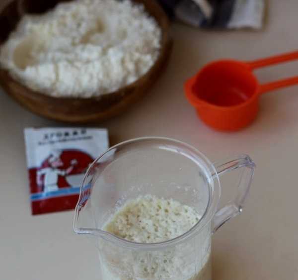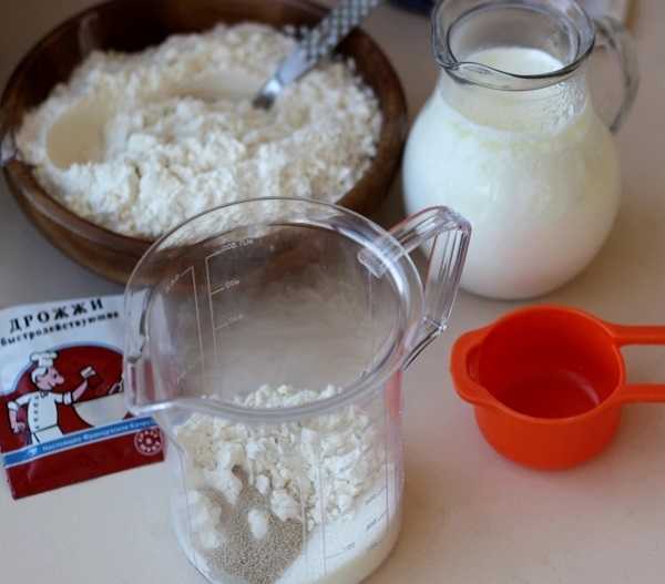1. В 100 мл теплого молока нужно добавить дрожжи, 1 чайную ложку сахара, 3-4 столовые ложки муки и размешать.