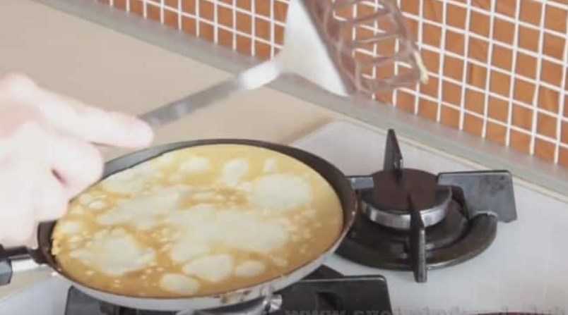 Теперь масса будет достаточно жидкой, чтобы печь блинчики. Дайте ей отстояться и через 10-15 минут начинайте готовить. Поставьте сковородку на средний огонь и раскалите. После того как посуда нагрелась, равномерно вылейте на дно немного теста. Как только на поверхности лепешки появятся пузырьки, переверните ее и обжарьте.