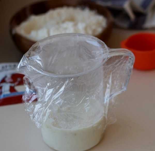 5. Тщательно все перемешиваем миксером, блендером или, на худой конец, венчиком, чтобы не осталось комочков. Накрываем миску пищевой пленкой и ставим в теплое место на 40 минут для «созревания» дрожжей.