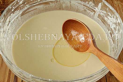 - По истечении времени в тесто влить растительное масло, перемешать и позволить настояться еще в течение получаса.