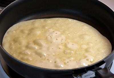 . Это нужно для того, чтобы тесто настоялось; - Используя половник налить тесто в сковороду, распределить его по всей площади;