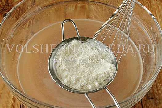 - Засыпьте в опару муку. подсыпайте понемногу, хорошо вымешивая. Обязательно просейте муку, чтобы блинчики получились по-настоящему вкусными.