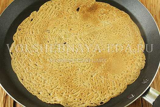 - Прогрейте сковороду, сделайте средний нагрев. Выпекайте блинчики обычным способом. Маслом поминальная выпечка не смазывается.