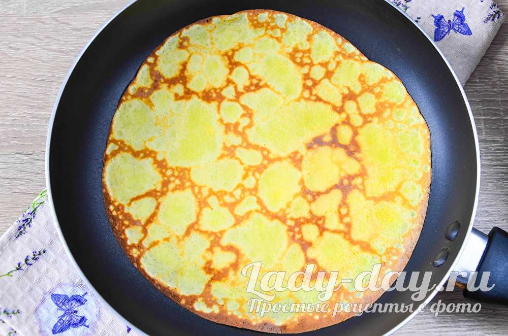 Разогреть сковороду и влить один половник теста, распределить его по дну сковороды с помощью круговых движений. Жарить на среднем огне до румяности по краям.