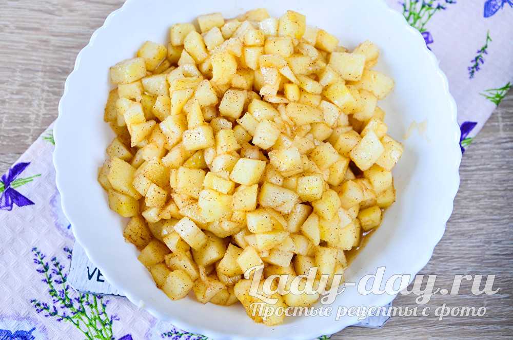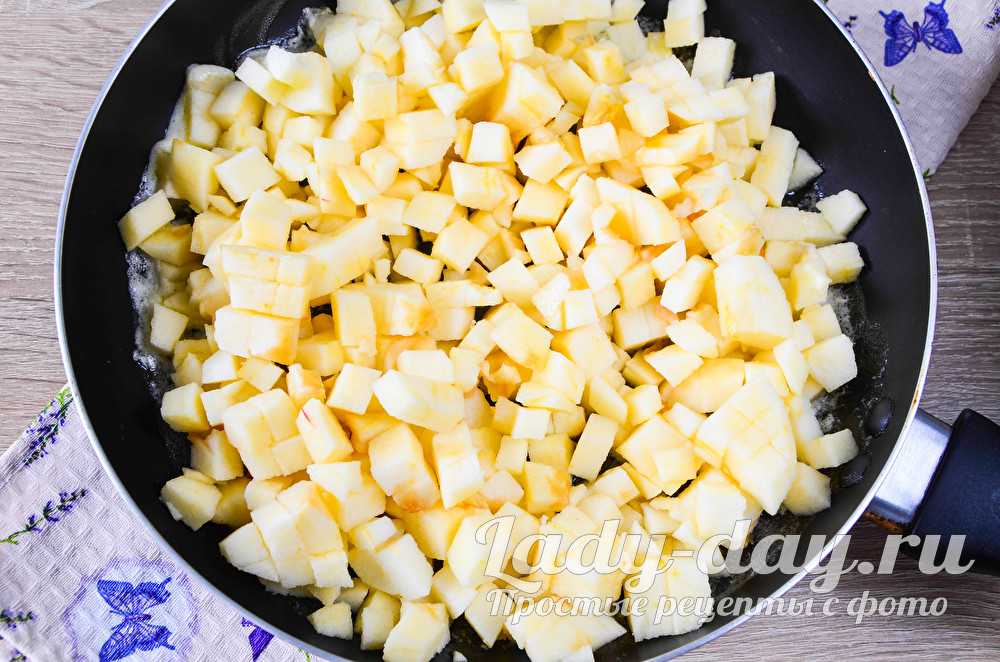 - Разрезать очищенные от кожуры яблоки на небольшие ломтики (сильно мелко резать не стоит, так как при поджаривании они превратятся в кашу).