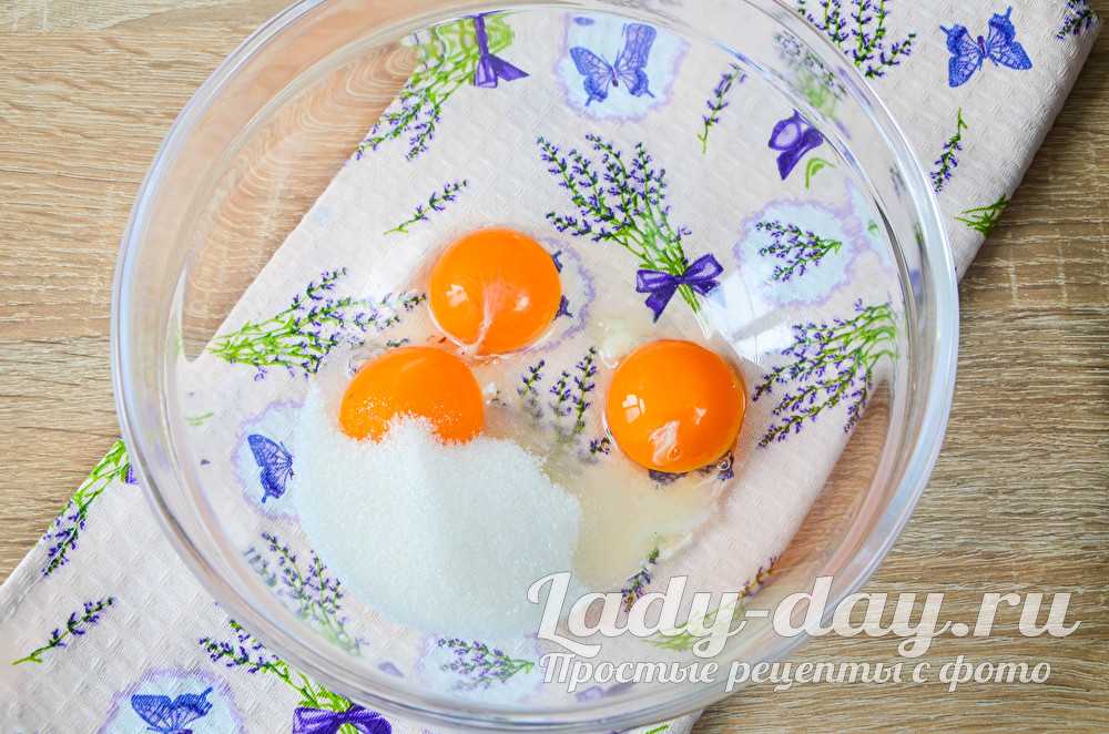 - Начнем с приготовления теста для блинов: смешаем яйца с сахаром и щепоткой соли.