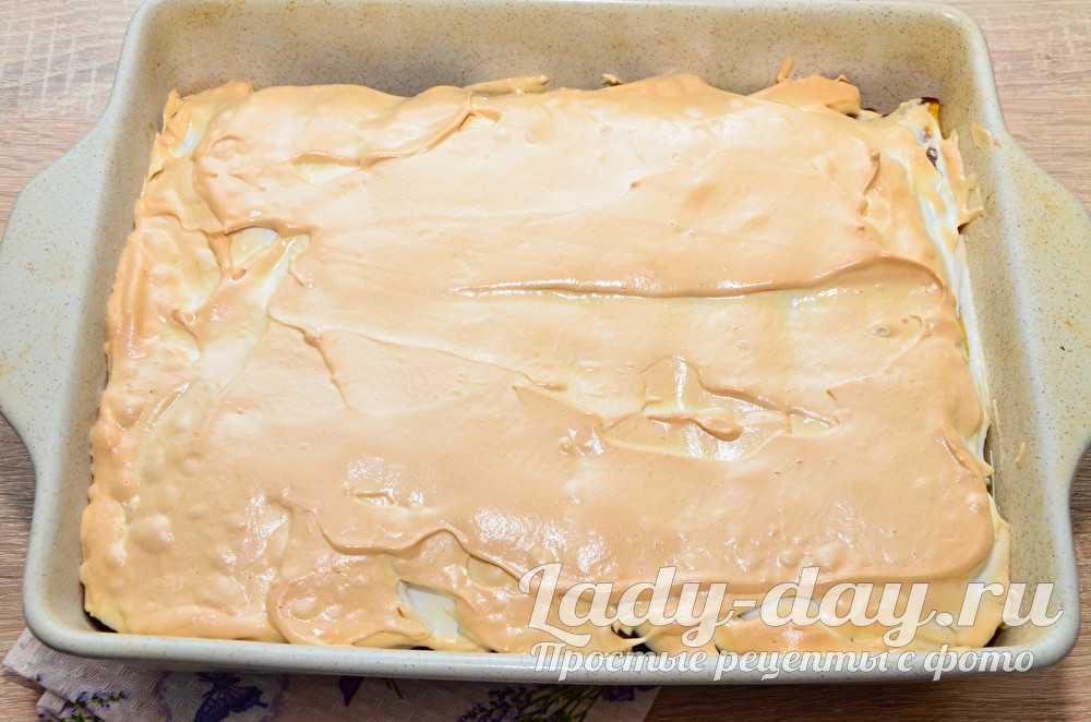 Форму для выпечки смазать сливочным маслом и плотно выложить блинчики с яблоками.