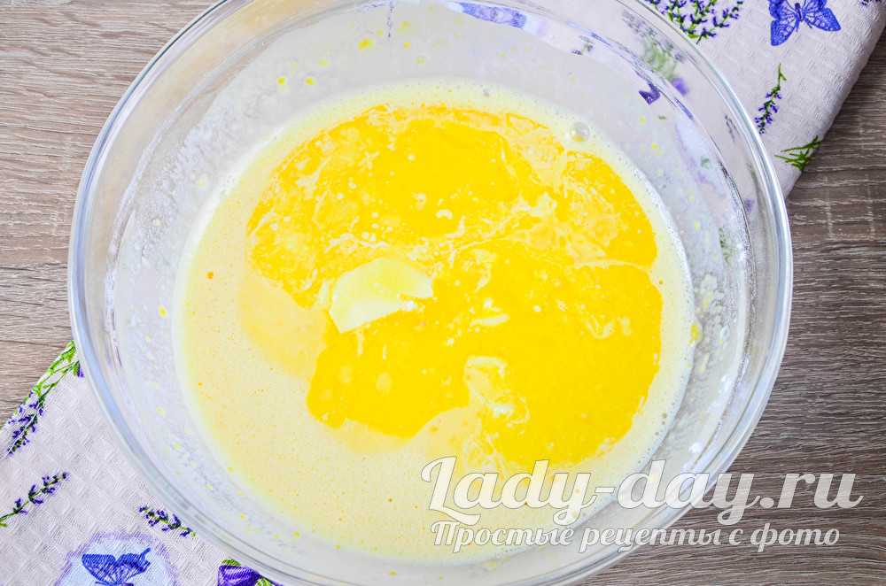 - Объединить с растопленным сливочным маслом и соком, хорошо перемешать.