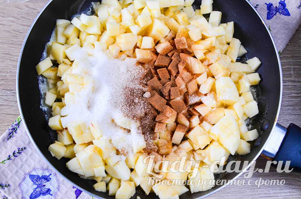 - Накрыть сковороду крышкой и карамелизовать яблоки 15 минут регулярно перемешивая.