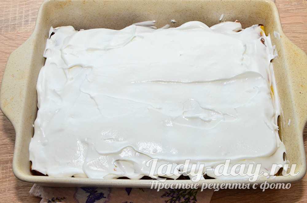 Выложить поверх блинчиков меренгу и равномерно ее распределить по всей поверхности.