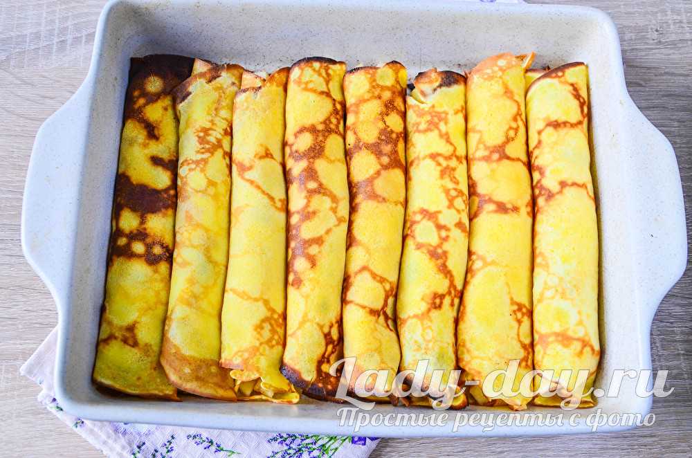 Важно! В этом рецепте будут использованы блины на кефире — они получаются особенно нежными. Но с таким же успехом вы можете использовать и другой рецепт приготовления ваших любимых блинчиков