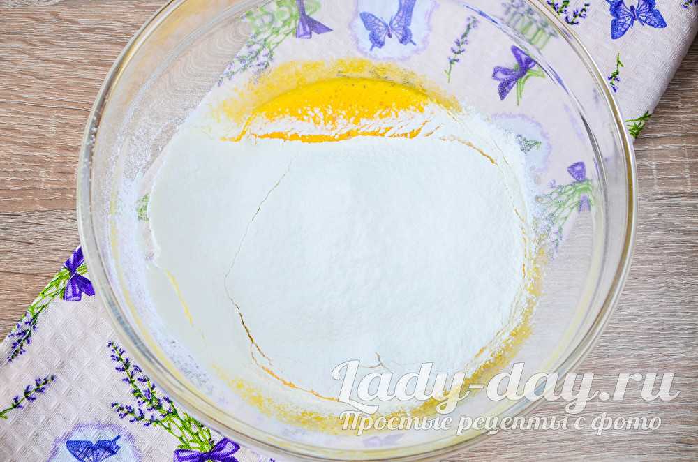 - Добавить часть муки и хорошо все смешать для получения однородности массы.