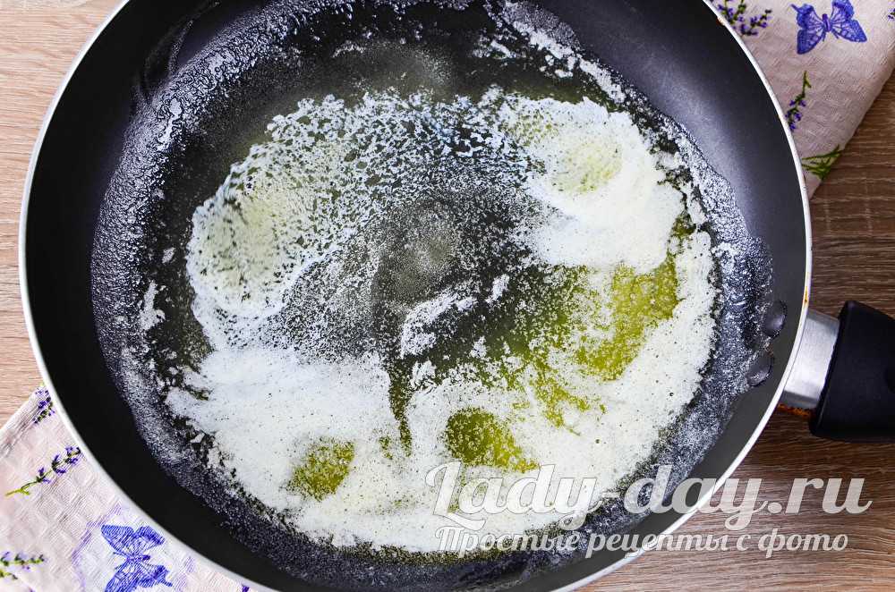 - Жарим блины на горячей сковороде с небольшим количеством подсолнечного масла.На заметку! Чтобы равномерно распределить масло по поверхности разрежьте небольшую картофелину и обмокните ее срезом в растительное масло, а затем проведите по сковородке.