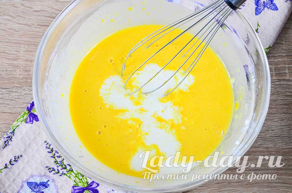 - Добавить оставшуюся муку (тесто должно иметь консистенцию похожую на жидкую сметану).
